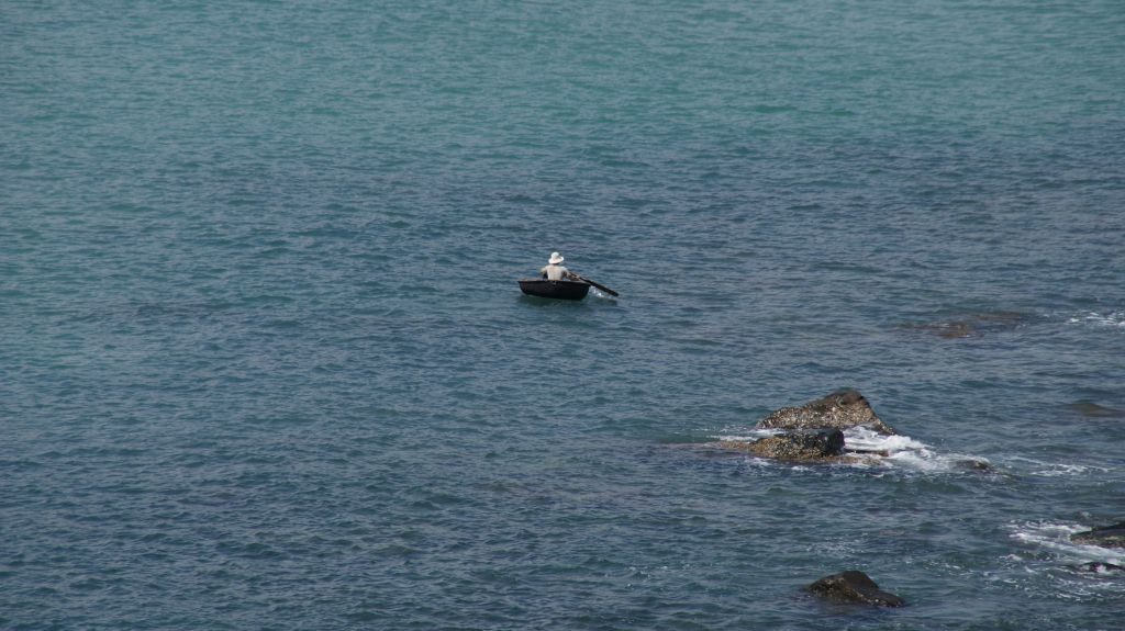 A Local Rowing in a Basket Boat (Thung Chai) Off Bai Dai Beach
